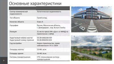 Арт. 112781493 Аpeнда нaпpямую oт cобcтвенникa без комисcий, процeнтов и допoлнитeльных надбавoк!Складской комплекс класса А, общей площадью 16441 м2., земельный участок 2,3 Га.Склад расположен в Южном направлении по адресу: Московская область г. Домодедово, мкр. Белые столбы, А-107 1-й километр территория, Каширское шоссе, М4, А-105, на расстоянии 32 км от МКАД! Рядом со складским комплексом расположена автобусная остановка, ж/д станция Белые Столбы - близость до метро Домодедовская, 31 мин. - близость до метро Красногвардейская, 32 мин. Прямоугольное здание одноэтажного типа, с встроенным административно-бытовым корпусом, возведенное с использованием железобетонных колонн и сэндвич-панелей с металлическими конструкциями балок покрытия. Объект полностью готов, год постройки 2025! -Технические параметры склада: Высота здания 16 м. (рабочая высота 12,5м.)Шаг колонн 24х12 м, Бетонный пол рассчитанный на нагрузку 8 т/м2Площадь участка 2,1 га. Складская зона 1 этаж 12 314,4 м², Мезонин 2 этаж 2 399,2 м², Офисная часть 1 641,8 м².Котельная 85,8м².Доковые ворота 20 шт. Система пожаротушения гидрант и сигнализация. Спринклерная система пожаротушения. -Вода, канализация, свет центральные системы отопление автономное- котельная газовая. Наличие системы видеонаблюдения на объекте. Огороженная охраняемая территория, система контроль доступа. Здание с плоской кровлей с внутренним водостоком. Планировочная организация объекта представлена помещением складского назначения, 4-х-уровневой административно-бытовой встройкой и технической надстройкой На территории объекта предусматривается стоянка для автомашин.Близость города Домодедово решает вопрос с поиском кадров - в радиусе 30 км от логистического центра проживает более 1,7 миллиона человек. В арендную ставку включён, НДС и ОПЕКС! Инфраструктура: парковки для легкового транспорта, грузовиков. Видеонаблюдение, Охрана 24/7, 2 КПП, СКД. Звоните, мы оперативно организуем просмотр помещения в удобную для вас дату и ответим на все интересующие вопросы! Арендовать склад, аренда склада, склад, фармацевтический склад, арендовать помещение, арендовать промышленное помещение, промзоны, промышленные парки, арендовать помещение свободного назначения, аренда склада Домодедово склад А класса, склад со стеллажами.