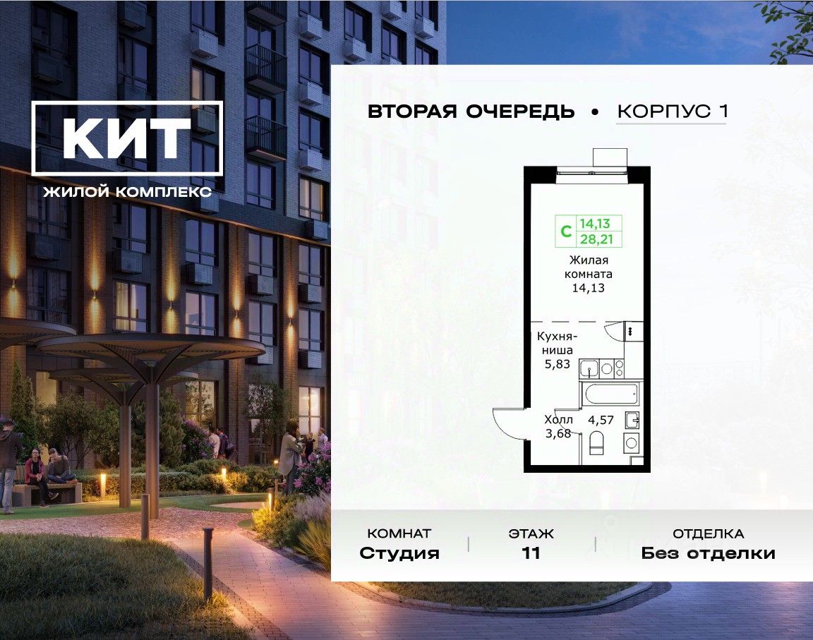 Продаётся студия 28.21 кв.м. без отделки в ЖК ''КИТ2'' на 11-м этаже 25 этажного дома.Жилой комплекс ''Кит 2'' спроектирован в урбанистической концепции ''Город в Городе''. Объект бизнес-класса предлагает рациональный подход к набору опций, необходимых для гармоничной жизни. Проект представляет собой два корпуса, которые образуют единую приватную территорию. Ее доминантой является двор с красивым ландшафтным дизайном и различными зонами, ориентированными на интересы жителей разного возраста. При создании пространства в приоритет ставился комфорт жителей. В шаговой доступности находятся: торговый центр, рестораны, кинотеатры, спортивный зал, образовательные учреждения и множество других объектов в сфере услуг.
