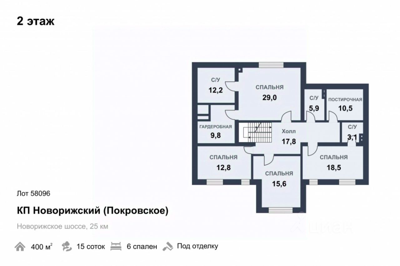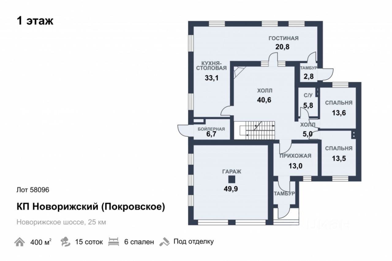 Лот 58096. Дом под отделку 400 кв.м. на участке 15.00 соток. Количество спален: 6. Коттеджный посёлок ''Новорижский (Покровское)'', Новорижское шоссе, 25 км от МКАД. Участок правильной, прямоугольной формы, ровный. Парковка для автомобилей. ШИКАРНАЯ ЛОКАЦИЯ В САМОМ ЦЕНТРЕ ПОСЕЛКА!!! Ригу не слышно, до прогулочной зоны с озером рукой подать, все респектабельные соседи построены и проживают! Качественный новый дом, стильный дизайн фасада, ведутся отделочные работы. В доме оштукатурены стены, разведено отопление и электричество, полностью оборудована котельная. Есть уникальная возможность на данном этапе внести изменения в проект, сделав интерьер дома именно Вашей мечты! 1 этаж: прихожая, выход в гараж на 2 мм, гардедробная, 2 жилых комнаты, су, кухня, столовая, гостиная с выход на участок, отдельно котельная 2 этаж: холл, 3-4 спальни, 3 су, гардеробная