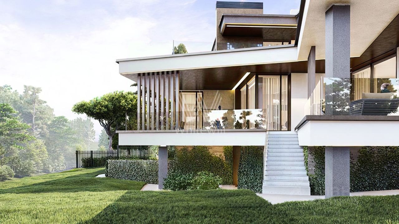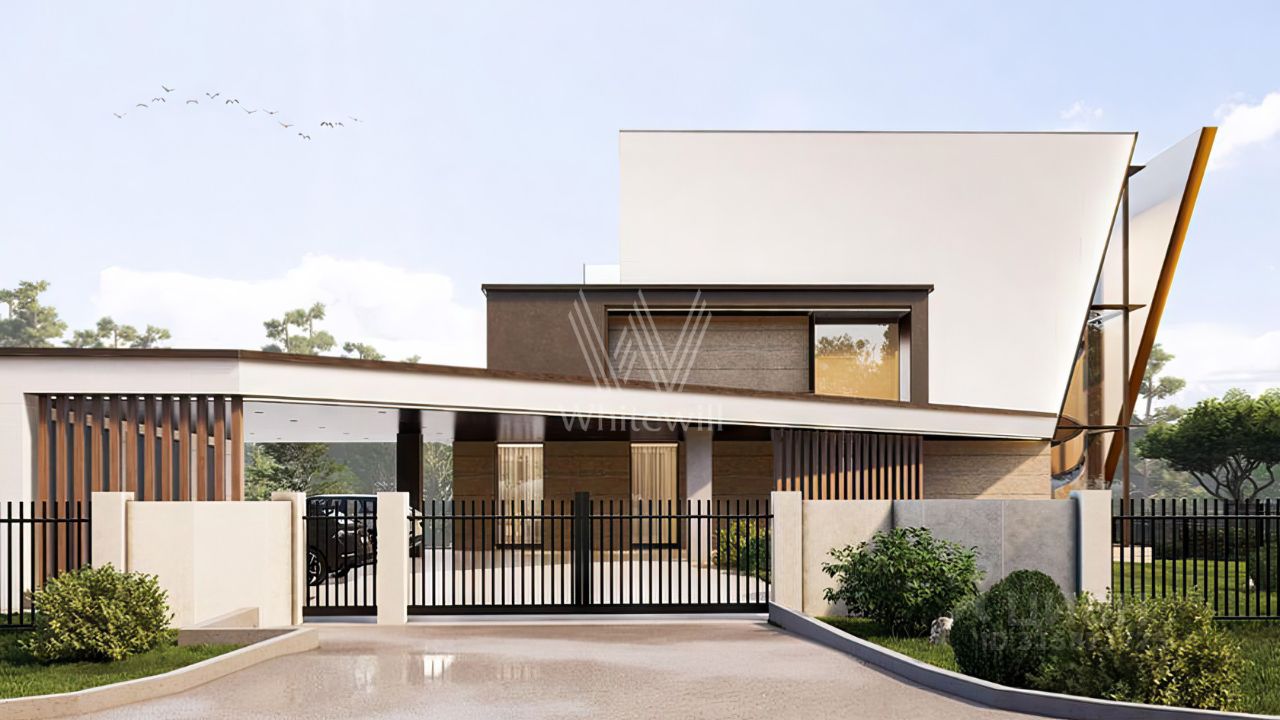 Планировка включает гостиную с возможностью установки камина, кухню, столовую, 3 спальни с гардеробными, кабинет, тренажерный зал и несколько террас, выход на которые доступен с каждого этажа. Дополнительно на территории предусмотрен гараж на 2 машины. Участок с аккуратным газоном открывает широкий потенциал для создания собственного ландшафтного проекта — можно дополнить участок тенистыми деревьями, декоративными кустарниками и цветниками, проложить изящные садовые дорожки и создать уютную зону для барбекю.