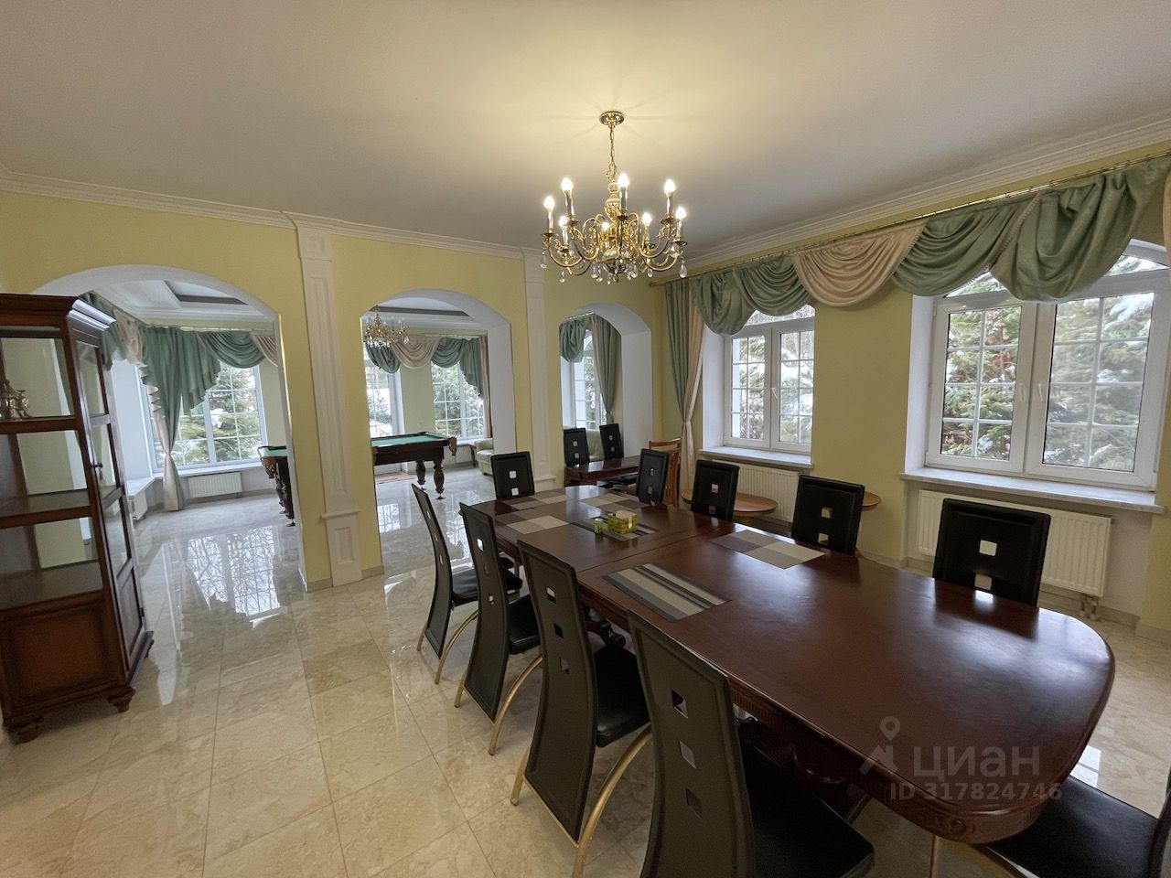 Первый этаж формирует парадное пространство для приема гостей и семейного времяпрепровождения. Входную группу составляют просторная прихожая и гостевой санузел. Далее расположены: гостевая комната с санузлом, столовая на 12 персон, кухня с итальянской мебелью в стиле модерн с двумя холодильниками, бильярдная и парадная гостиная с камином с панорамным окном на лес, с выходом на красивейшую, интегрированную в ландшафт террасу, включающую в себя прекрасную беседку-ротонду с обеденным столом на шесть персон и солярий с цветниками, креслами, чайным столиком и лежаками.
