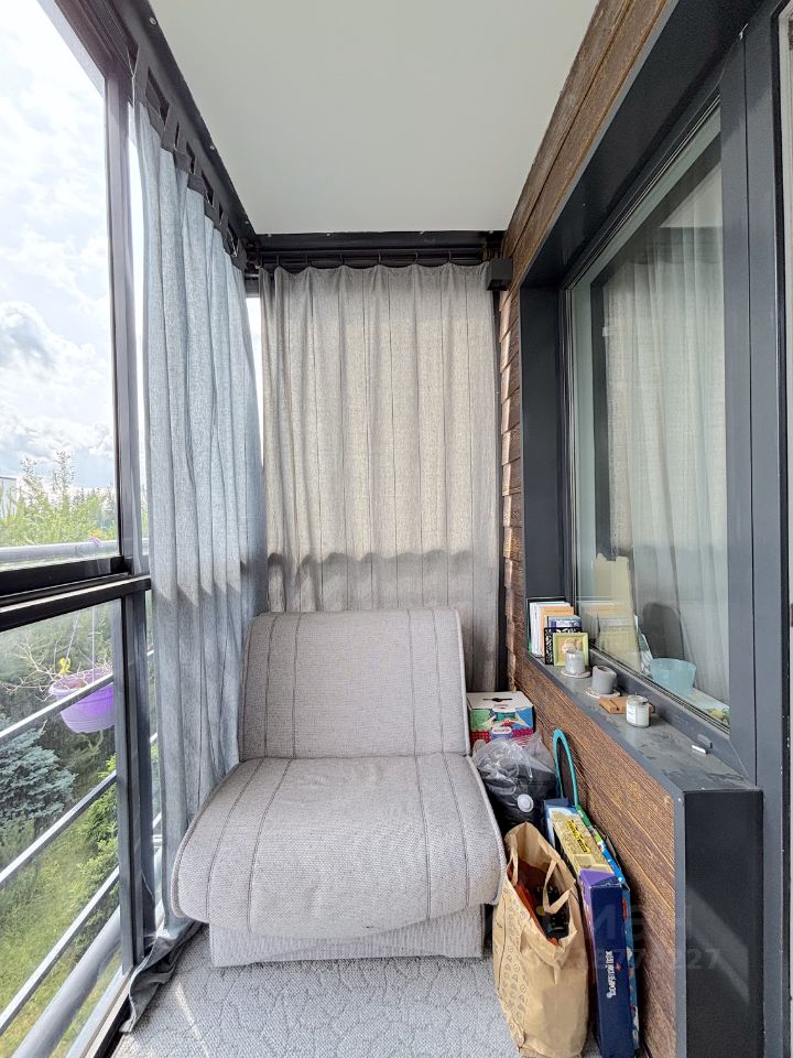 Широкие оконные проемы, благодаря которым в комнаты поступает много света. Просторный балкон с диваном и окнами в пол.
