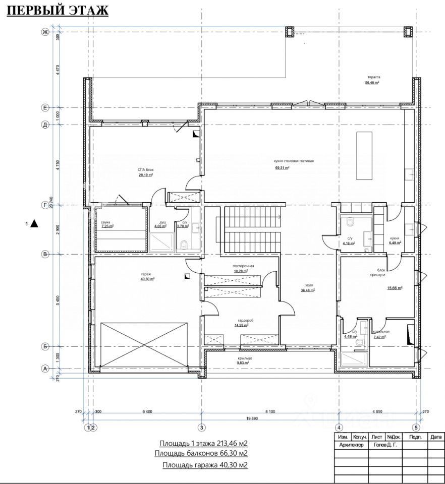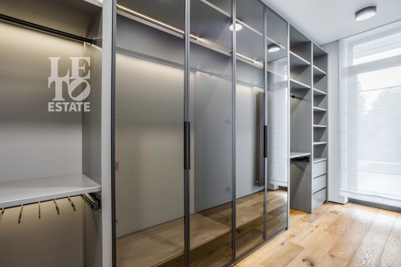Планировка: Первый этаж: прихожая, гостиная-кухня-столовая с выходом на летнюю террасу, спальня с санузлом и гардеробной, котельная, гараж на два автомобиля. Второй этаж: холл, четыре спальни с санузлами и гардеробными.