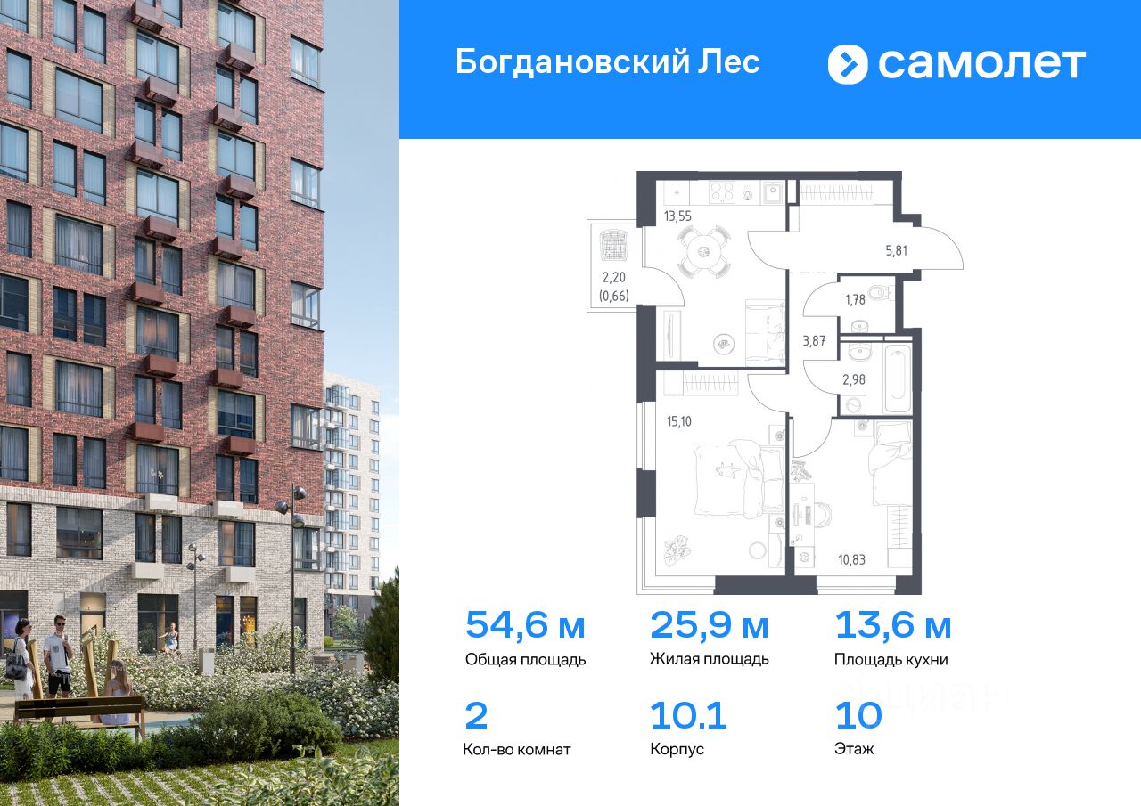 Предлагается 2-комнатная квартира комфорт-класса 54,58 кв.м в корпусе 10.1 на 10 этаже, в ЖК ''Богдановский Лес'' Квартира без отделки. Доступность опции ''отделка'' и возможность комплектации мебелью и декором уточняйте у застройщика.