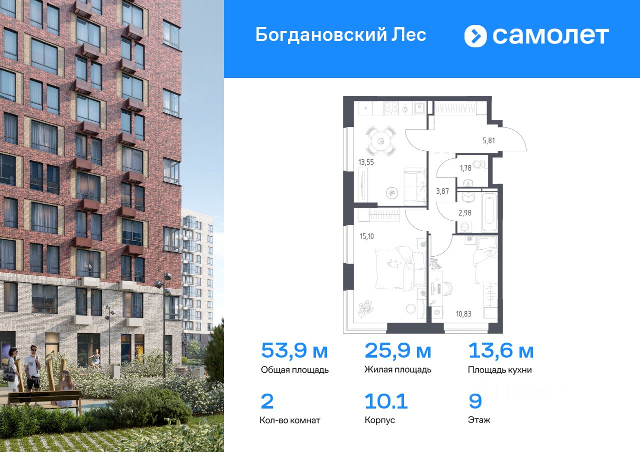 Предлагается 2-комнатная квартира комфорт-класса 53,92 кв.м в корпусе 10.1 на 9 этаже, в ЖК ''Богдановский Лес'' Квартира без отделки. Доступность опции ''отделка'' и возможность комплектации мебелью и декором уточняйте у застройщика.