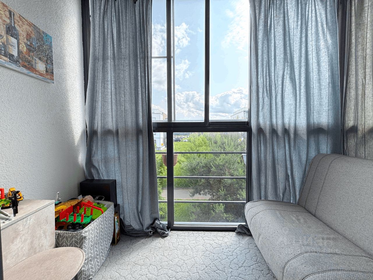 Широкие оконные проемы, благодаря которым в комнаты поступает много света. Просторный балкон с диваном и окнами в пол.