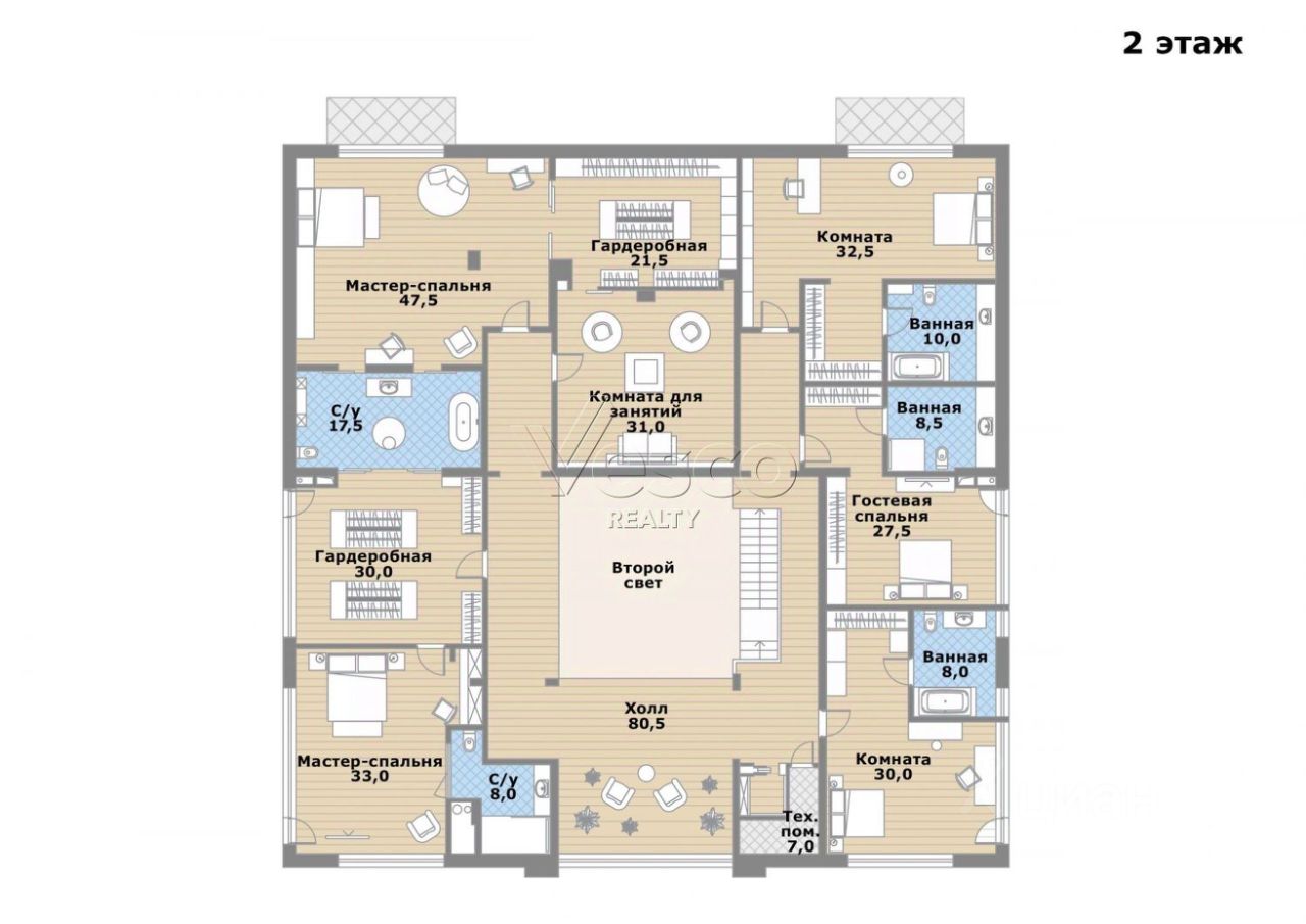 2 этаж. Master-suite: две спальни (47,5 и 33) с двумя гардеробными (21,5 и 30), ванной (17,5) и с/у (8), комнатой для занятий или досуга (31). Спальня (32,5) с ванной (10), спальня (30) с ванной (8), спальня (27,5) с ванной (8,5), холл (80,5), тех помещение (7).
