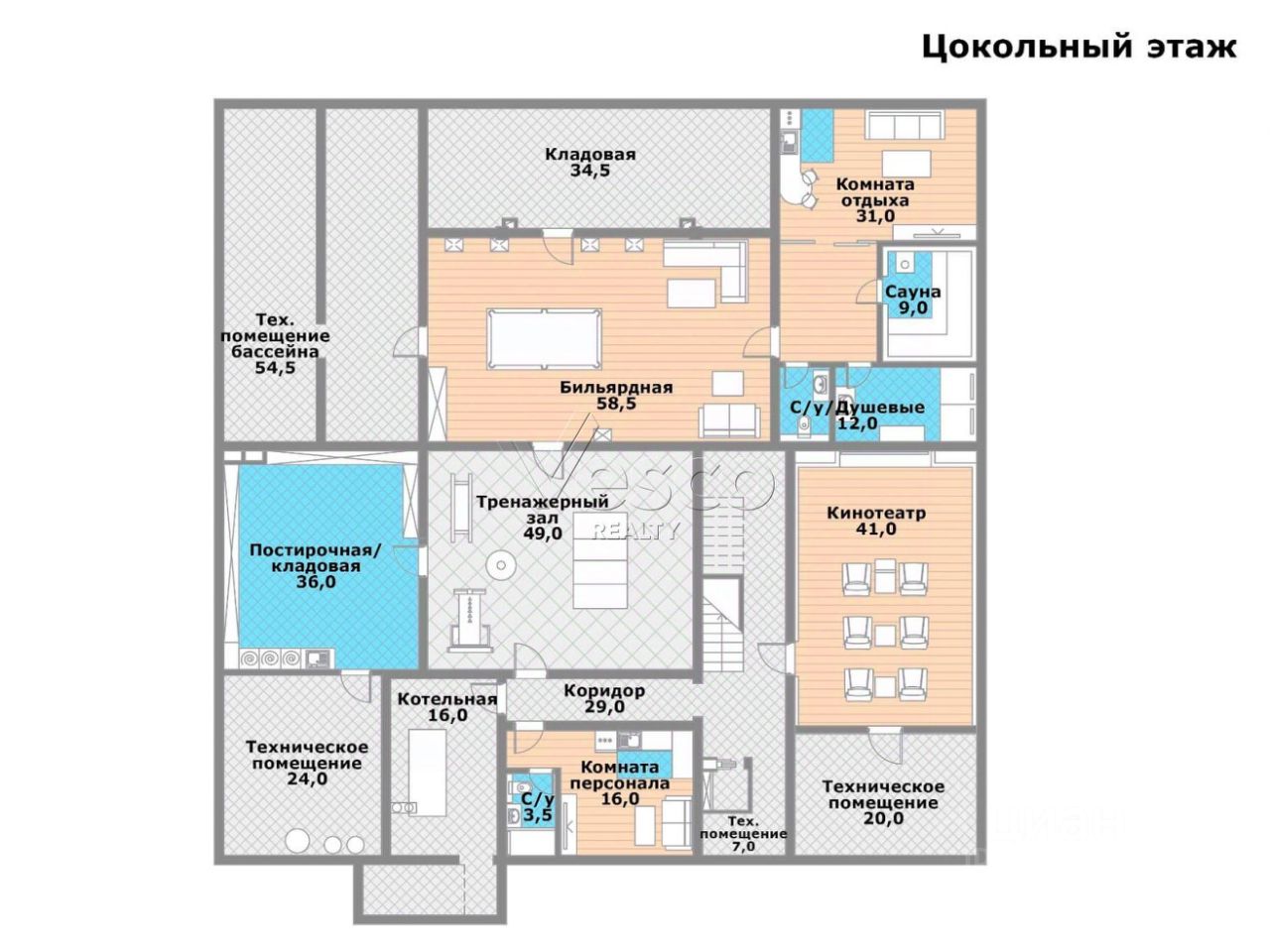 Цоколь. Бильярдная (58,5), кинотеатр (41), тренажерный зал (49), сауна (9) с комнатой отдыха (31) и душевой с с/у (12), постирочная (36), комната персонала (16) с с/у (3,5), котельная (16), технические помещения (24, 20 и 7), кладовая (34,5), тех помещение бассейна (54,5), коридор (29).