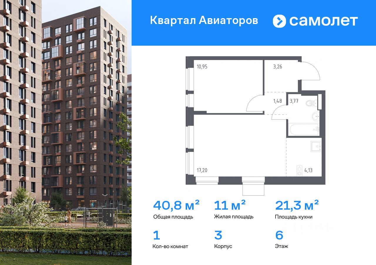 Строим кварталы для жизни с заботой о будущем. Предлагается 1-комнатная квартира комфорт-класса 40,79 кв.м в корпусе 3 на 6 этаже, в ЖК ''Квартал Авиаторов'' Квартира с предчистовой отделкой. Доступность дополнительных опций уточняйте у застройщика.