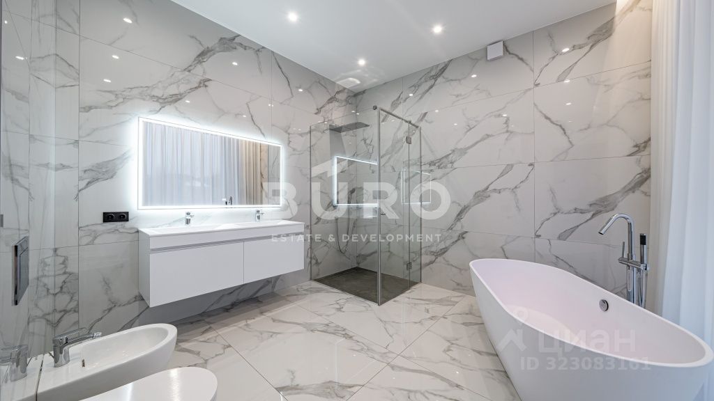 В санузлах установлена сантехника известных производителей. Большая площадь остекления и высокие потолки делают дом светлым и просторным.