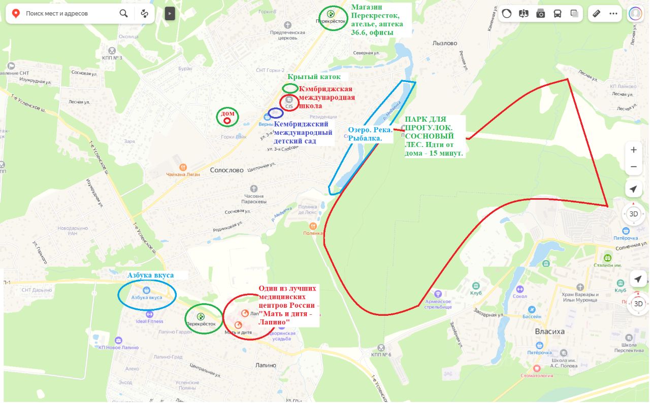 Участок расположен в приватной локации, дом гармонично вписан в природный ландшафт и окружён взрослыми соснами и елями — ощущение уединения и тишины. Солидные, интеллигентные соседи. Cambridge International School (CIS) — в пешей доступности от дома.