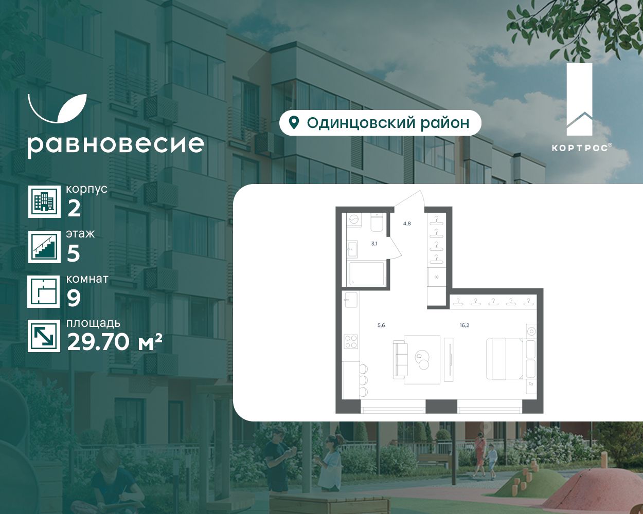 Продаётся квартира-студия общей площадью 29.70 кв. метров на 5 этаже жилого квартала комфорт-класса ''Равновесие''.