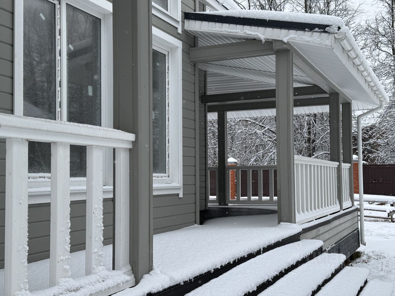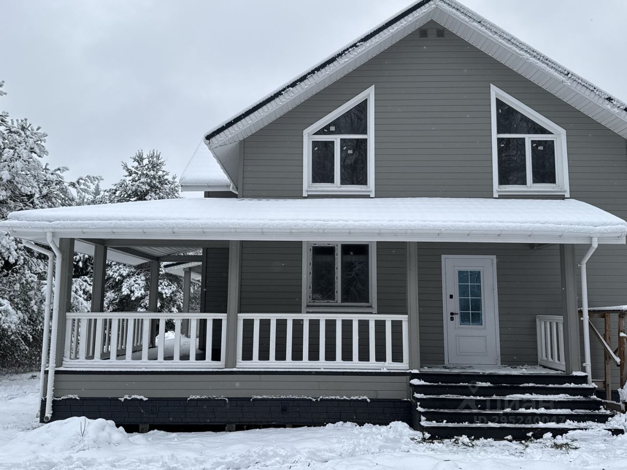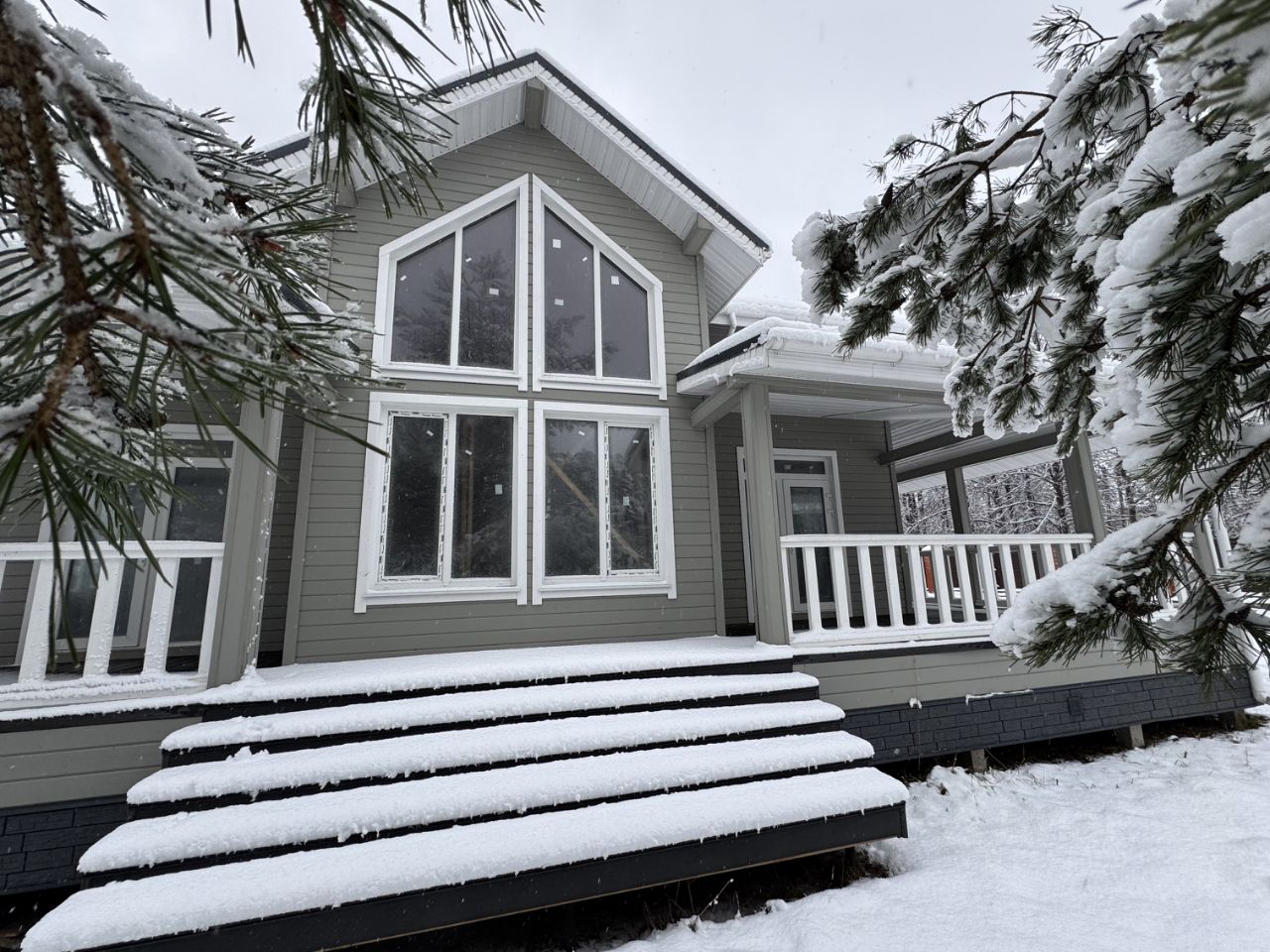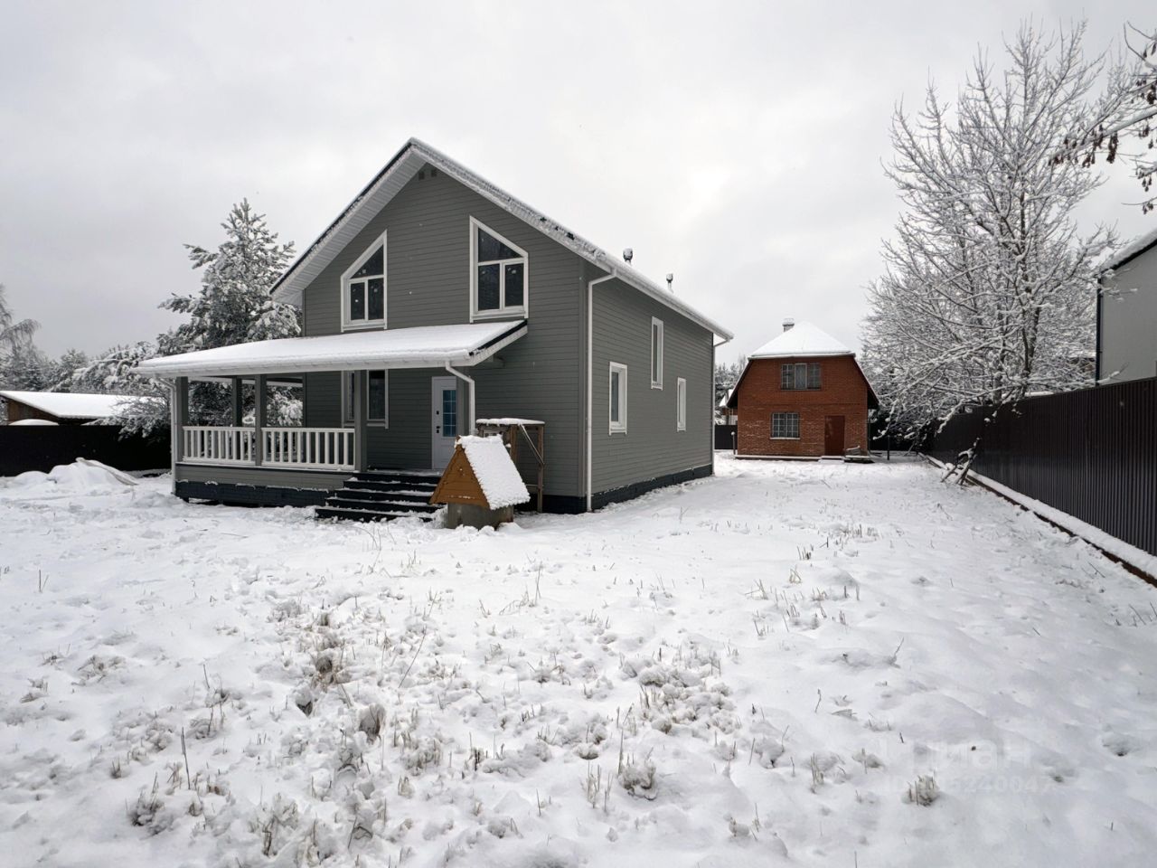 Дом 1 — каркасный, 218,8 м², 2 этажа, введён в эксплуатацию в декабре 2023 г. Фундамент — ж/б сваи. Стены — трёхслойные: имитация бруса, утепление базальтовыми матами 200 мм, ветро-влагозащита. Высота потолков: 1-й эт. — 2,8 м, 2-й эт. — до 4 м (в зоне второго света). Планировка: 4 спальни (в т.ч. master-bedroom с гардеробом и с/у), кухня-гостиная 33,5 м² с выходом на террасу, остеклённая веранда 34,5 м², 2 с/у, котельная. Коммуникации: электрика 15 кВт (трёхфазная), газ по границе (труба прямо возле ограждения), колодец, место под септик. Дом сдан под чистовую отделку — стены и полы выровнены. Возможна корректировка точек электромонтажа по проекту покупателя.